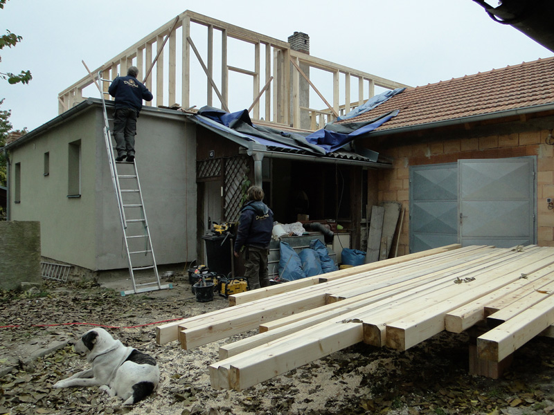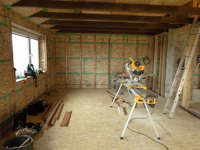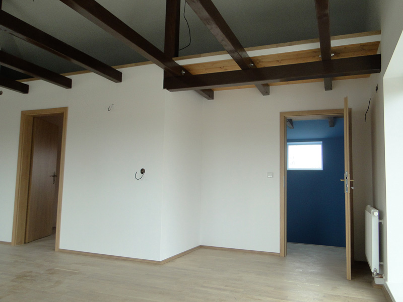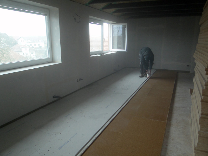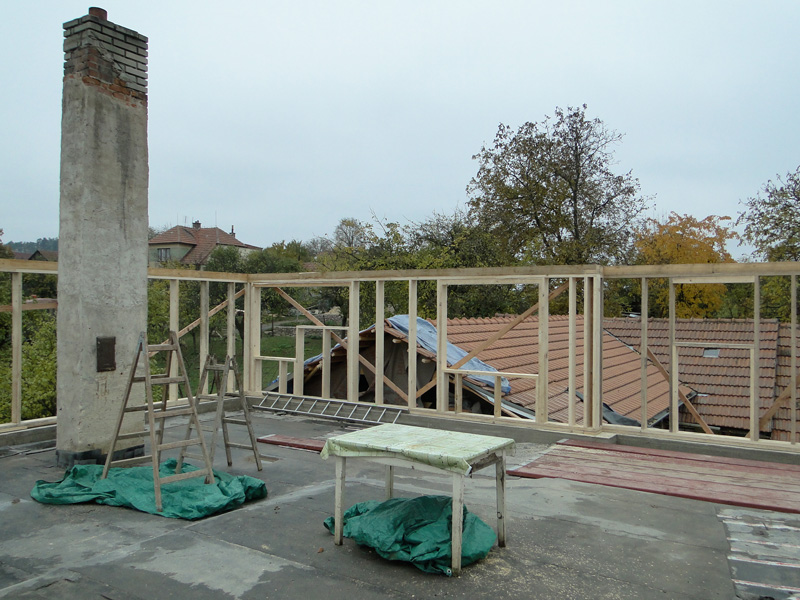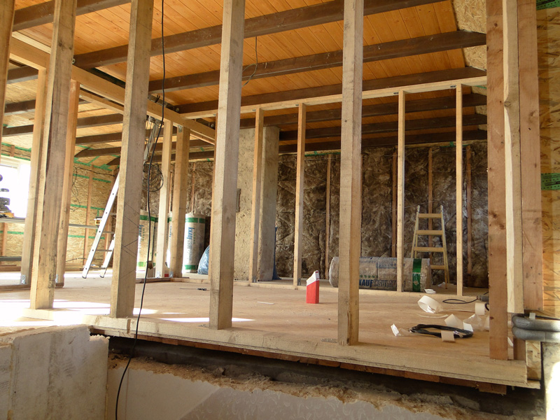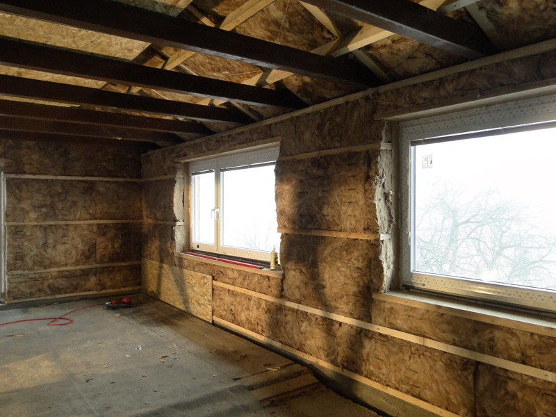 Rámová dřevostavba podkroví s izolací z minerální vaty.